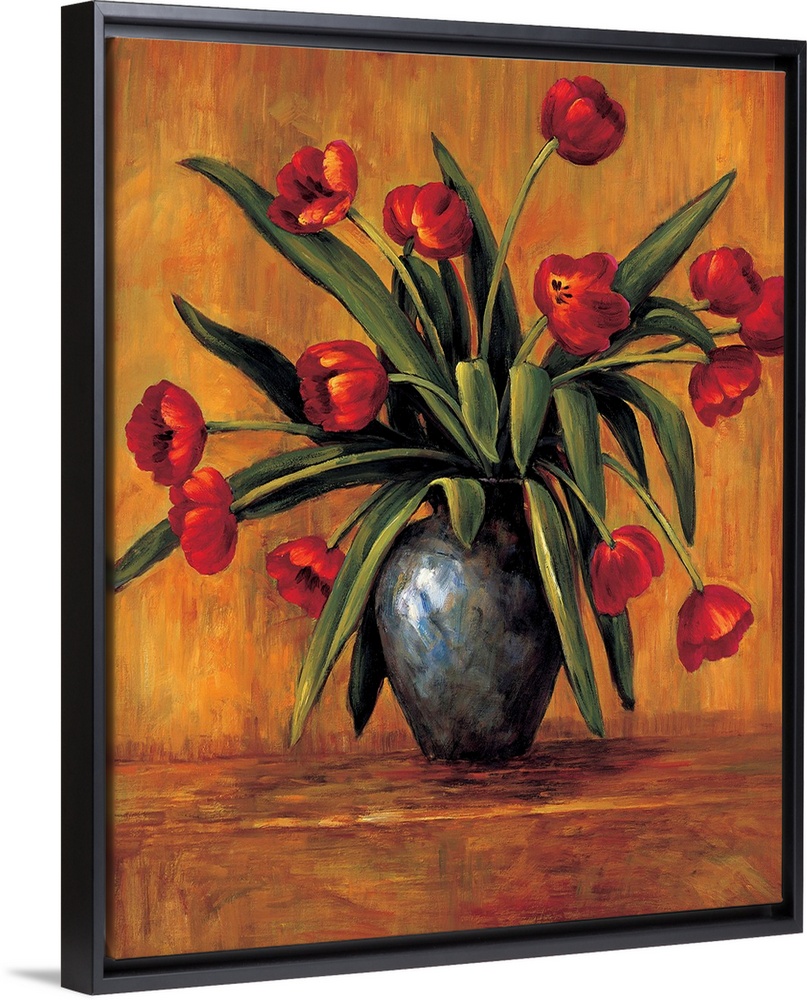 <p>Contemporary painting of red tulips in a vase with an orange, red, and brown background.</p>