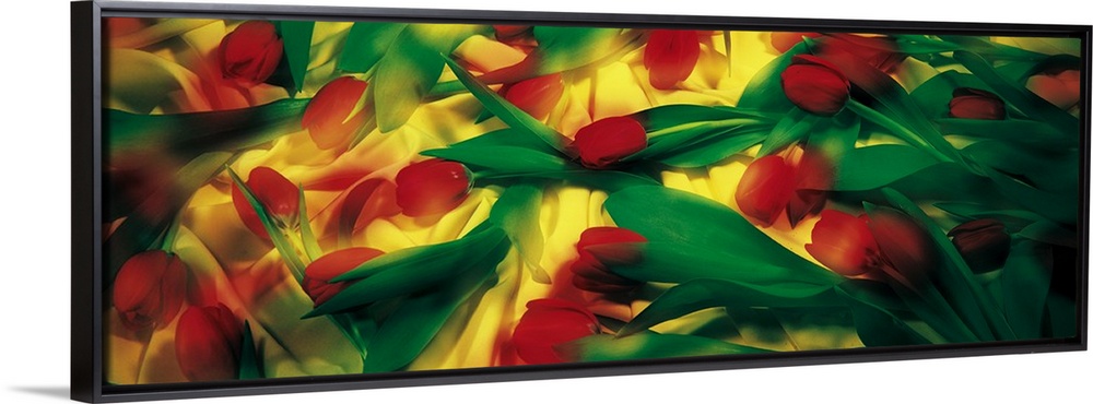 <p>Panoramic soft focus photograph of flowers scattered on top of a bright silky fabric.</p>