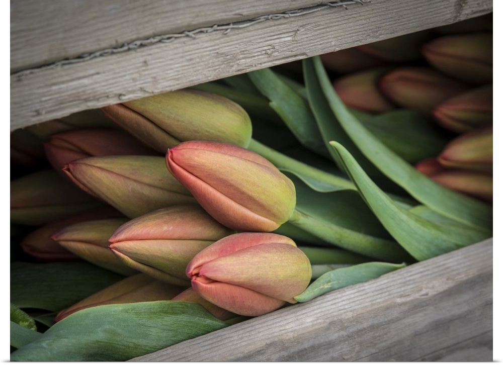<p>USA, Washington State, Mt. Vernon. Cut red tulips in wood crate at Skagit Valley Tulip Festival, held annually in April.</p>
