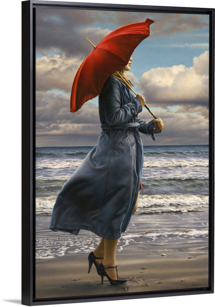 <p>Contemporary painting of a woman holding a red umbrella, while walking on a windy beach.</p>