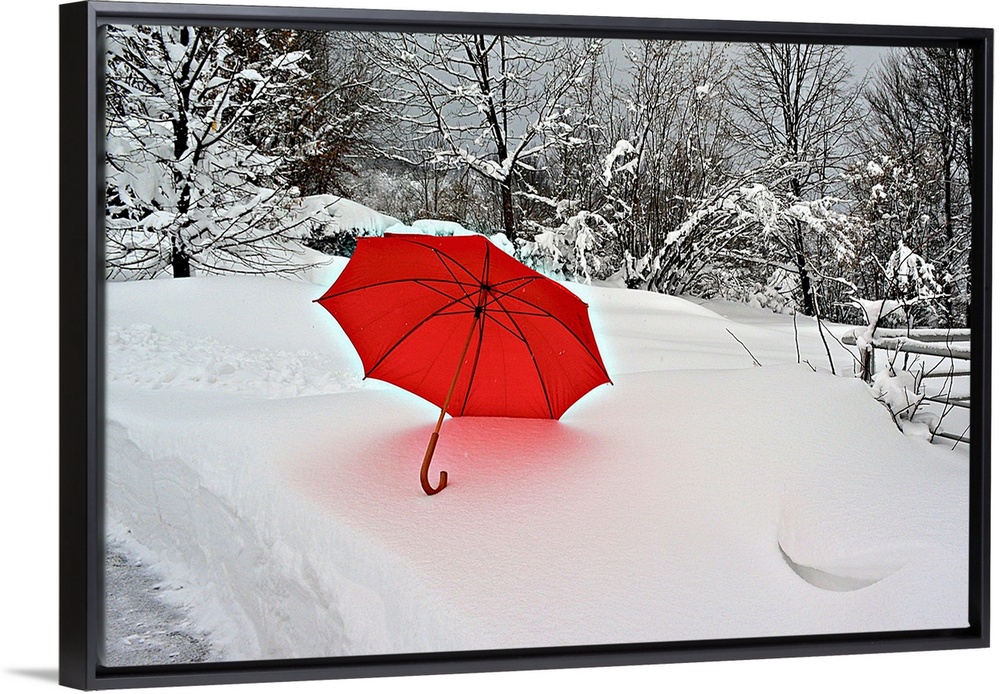 <p>A bright red umbrella stands out against the white snowscape.</p>