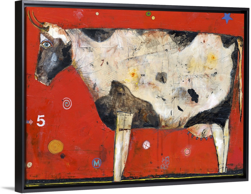 <p>Lighthearted contemporary painting of cow against a red background.</p>
