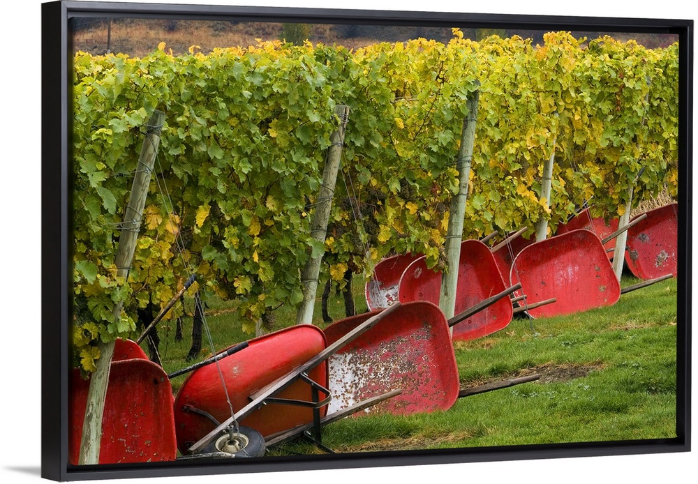 <p>Red wheel barrows used for harvest lie on their sides at the edge of Fall-colored vines of Gehring Brothers Vineyards in Okanagan Valley, BC, Canada.</p>