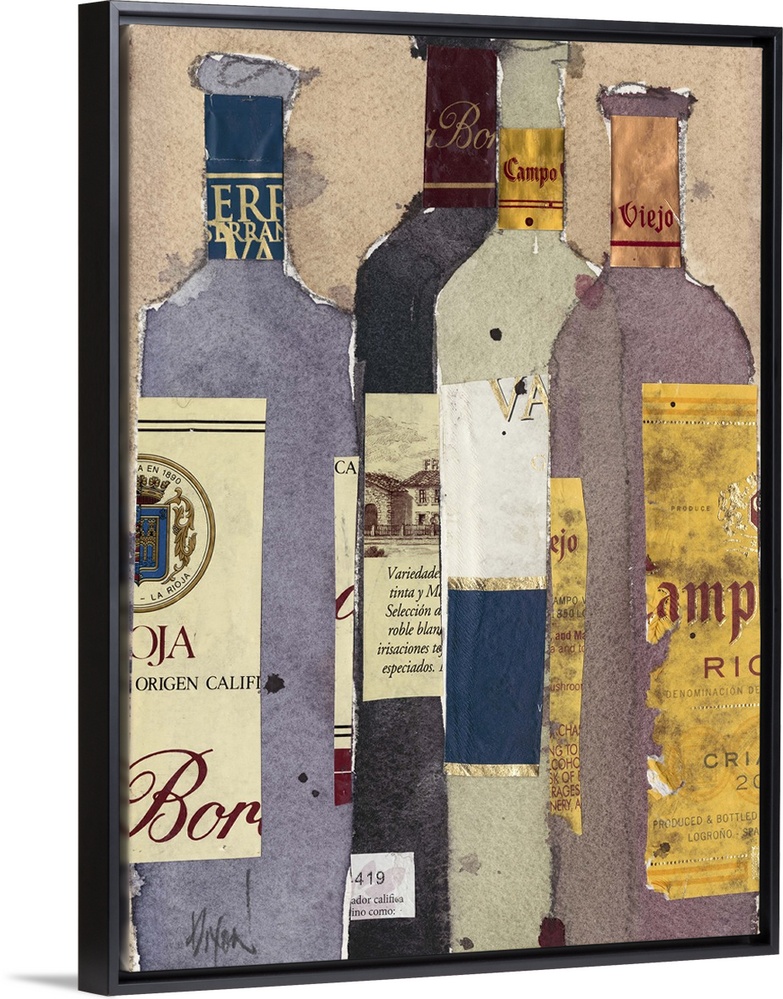 <p>Contemporary home decor artwork of a group of wine bottles made from collage style clippings of paper and paint.</p>