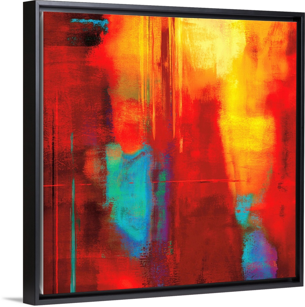 <p>Bright red square abstract art with cool hints of blue, green, and purple.</p>