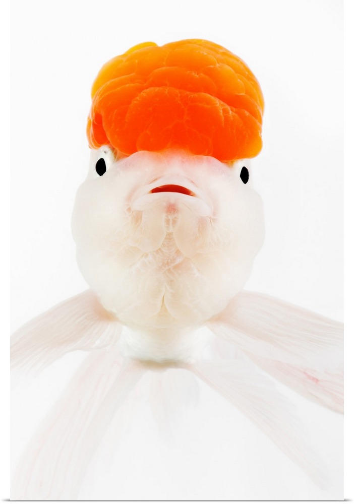 <p>Redcap lionhead goldfish (Carassius auratus). Hooded variety of fancy goldfish. Close up. Studio shot against white background.</p>