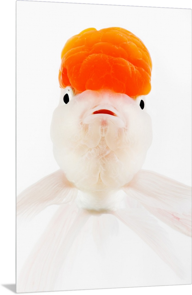<p>Redcap lionhead goldfish (Carassius auratus). Hooded variety of fancy goldfish. Close up. Studio shot against white background.</p>