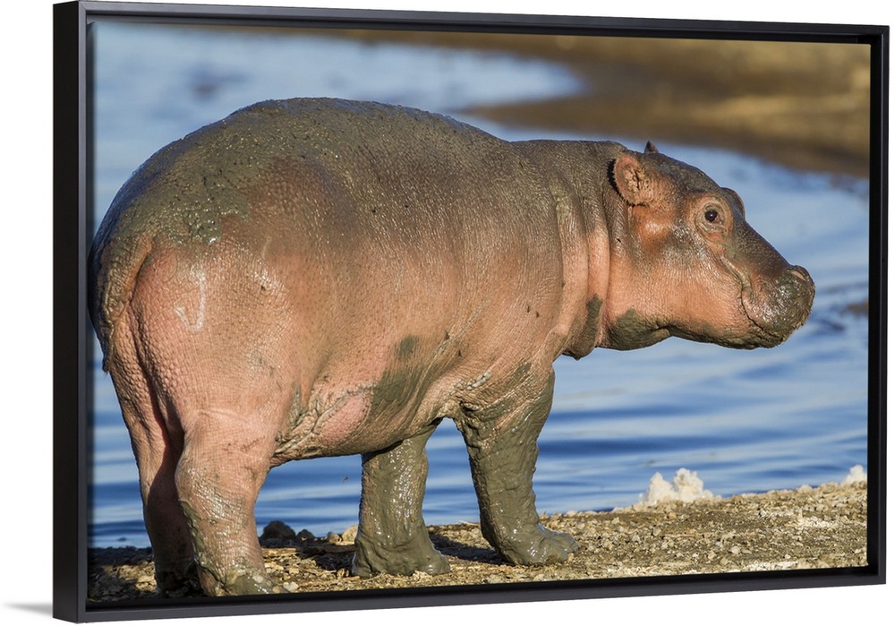<p>Reddish very young hippo stands on shoreline of Lake Ndutu, profile view, eye looking at camera.</p>