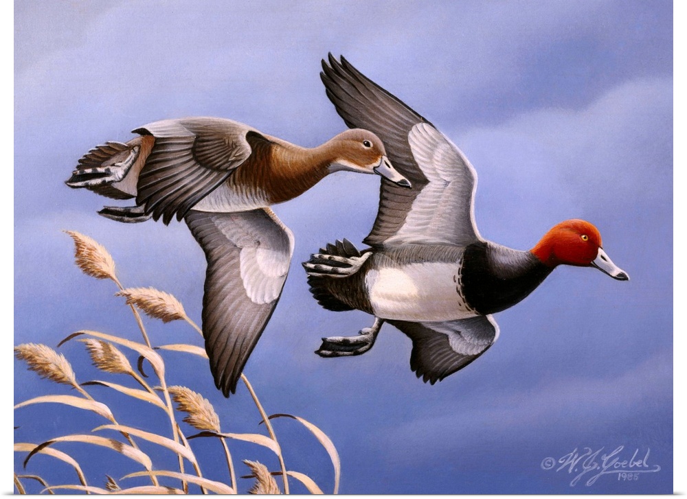 <p>Two redhead ducks in flight.</p>