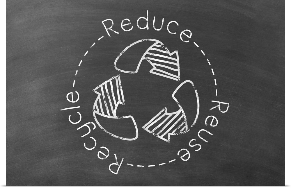 <p>Reduce Reuse Recycle written in white in a circle around a recycling symbol on a black chalkboard background.</p>