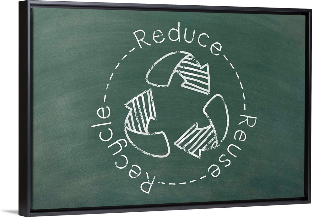 <p>Reduce Reuse Recycle written in white in a circle around a recycling symbol on a green chalkboard background.</p>