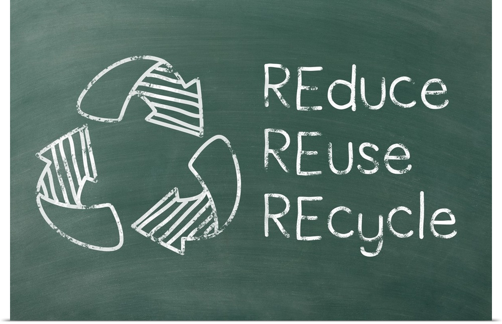 <p>REduce REuse REcycle and the recycling symbol written in white on a green chalkboard background.</p>