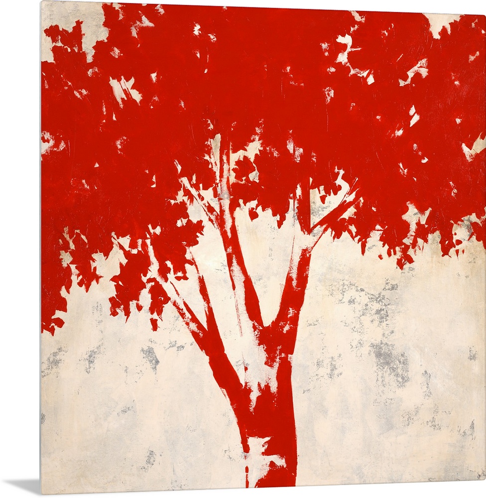 <p>Contemporary art of a large red tree with branches full of leaves on a light neutral background that resembles parchment.</p>