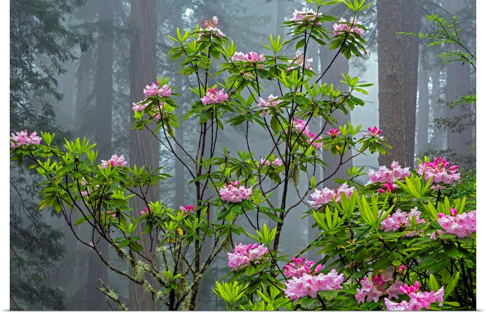 <p>CA, Redwood National Park, Lady Bird Johnson Grove, redwood trees with rhododendrons.</p>