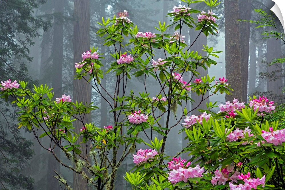 <p>CA, Redwood National Park, Lady Bird Johnson Grove, redwood trees with rhododendrons.</p>