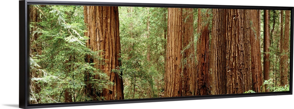 <p>Panoramic photo of the up close view of big redwood trees in California.</p>