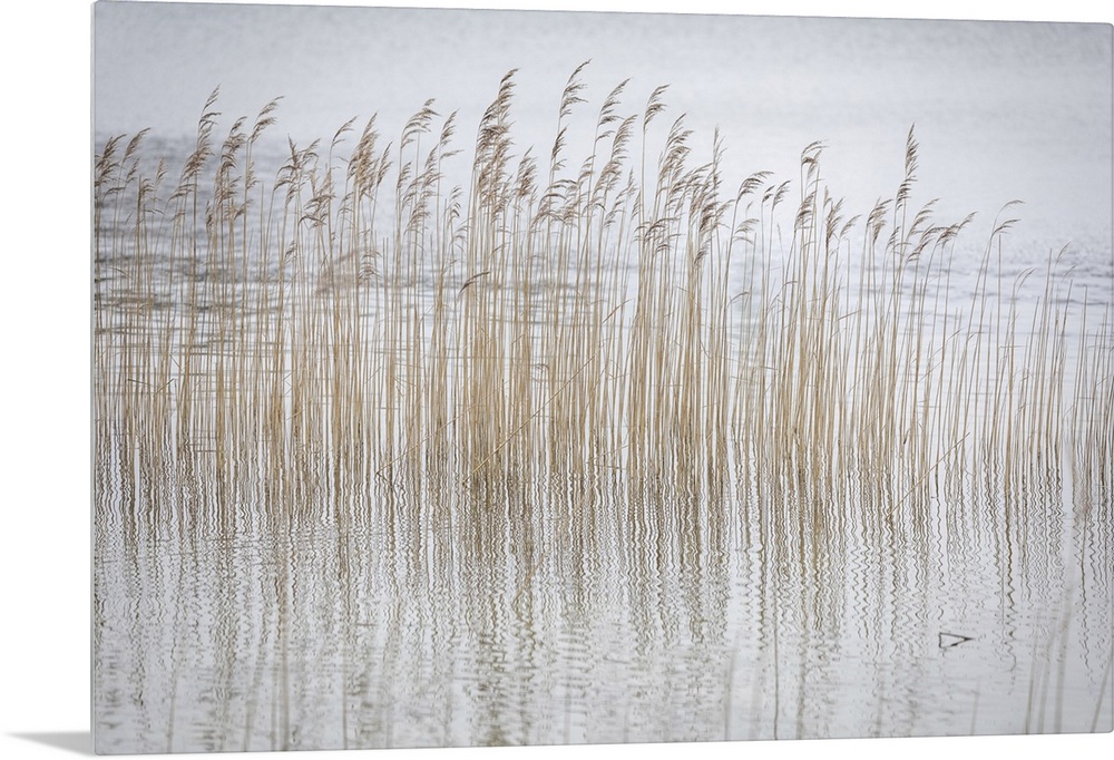 <p>Reed grass in the fog at Weissensee near Fuessen, Allgaeu, Bavaria, Germany.</p>