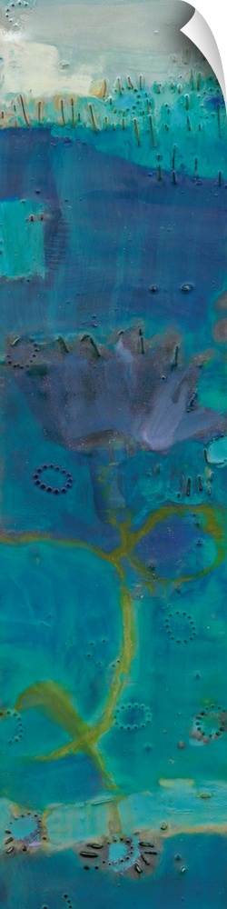 <p>This painted contemporary artwork resembles rusting metal that has stood the test of time in vibrant blues, beige and green colors.</p>