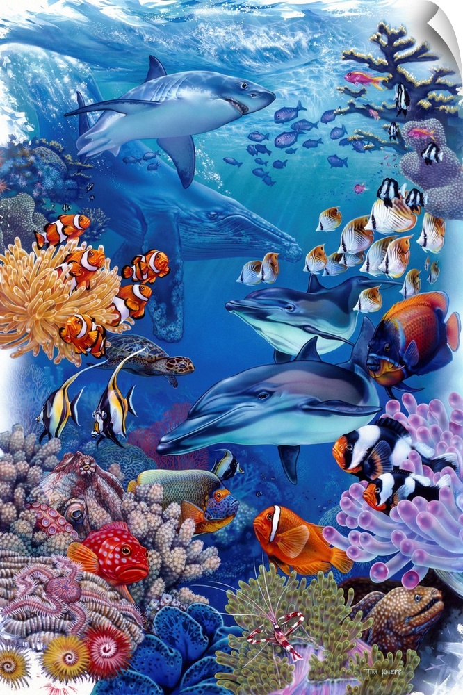 <p>underwater scene with dolphins, shark, clown fish</p>