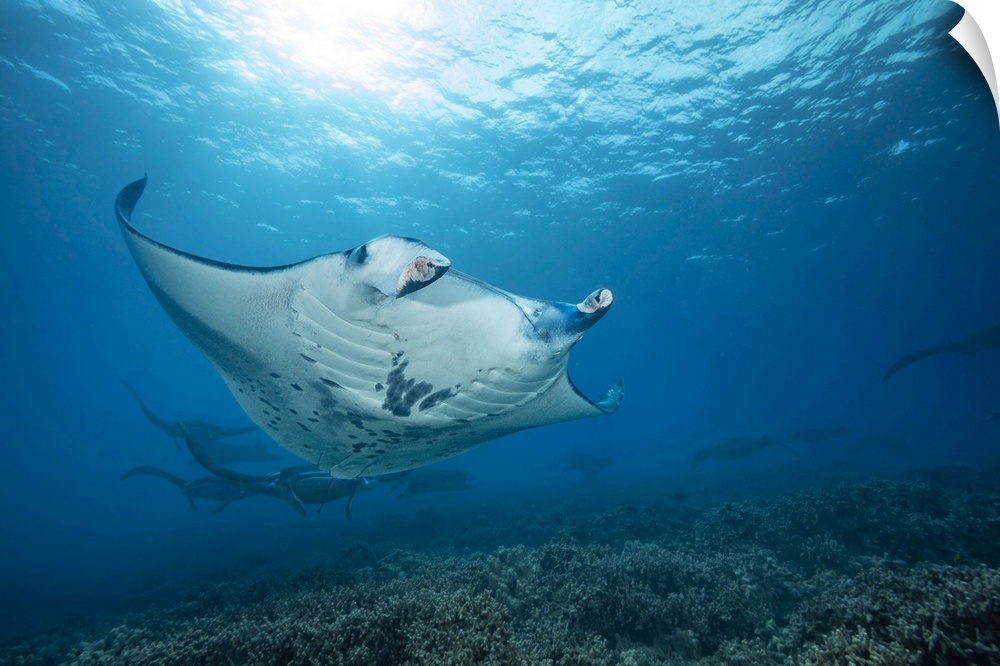 <p>Reef manta rays (manta alfredi) cruise over the shallows off Ukumehame in a mating train. The female is in the foreground and leads this procession, Maui, Hawaii, united states of America.</p>