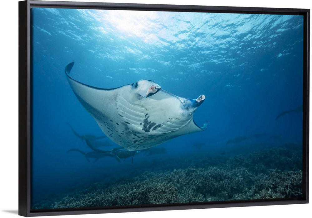 <p>Reef manta rays (manta alfredi) cruise over the shallows off Ukumehame in a mating train. The female is in the foreground and leads this procession, Maui, Hawaii, united states of America.</p>