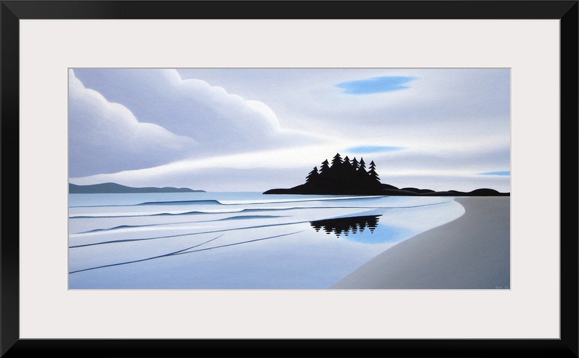 <p>Contemporary painting of a seascape from a beach, with mountains in the distance.</p>