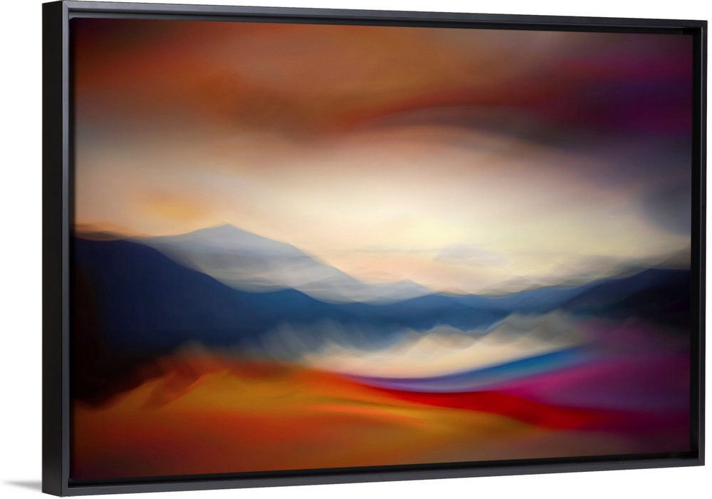 <p>Abstract image of Slocan Lake, giving an impression of a sunset over the lake. The image is a combination of two exposures, one of the lake made using the ICM(Intentional Camera Movement) technique, the second a colourful closeup of water made in studio. The shapes are created by the image of the lake, the colors and texture come from the second image. Ursula Abresch Fantastic Landscapes Collection.</p>