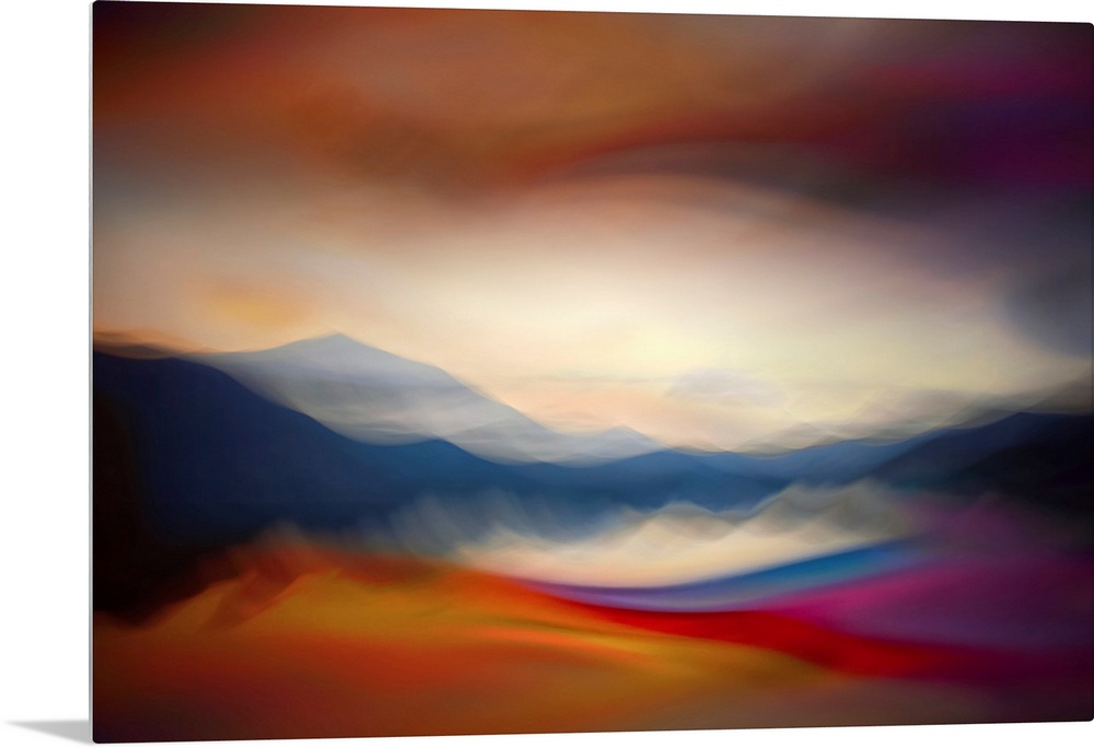 <p>Abstract image of Slocan Lake, giving an impression of a sunset over the lake. The image is a combination of two exposures, one of the lake made using the ICM(Intentional Camera Movement) technique, the second a colourful closeup of water made in studio. The shapes are created by the image of the lake, the colors and texture come from the second image. Ursula Abresch Fantastic Landscapes Collection.</p>