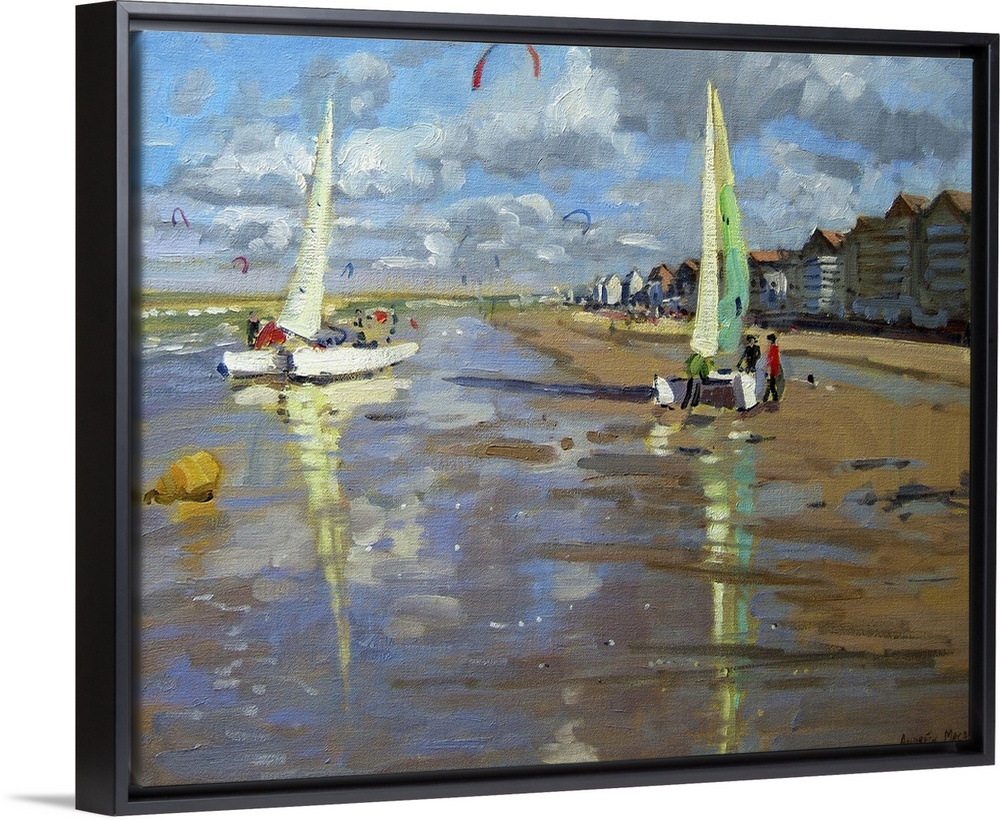 <p>Piece of contemporary artwork that has two sail boats about to set off in the ocean. The beach is lined with houses to the right.</p>