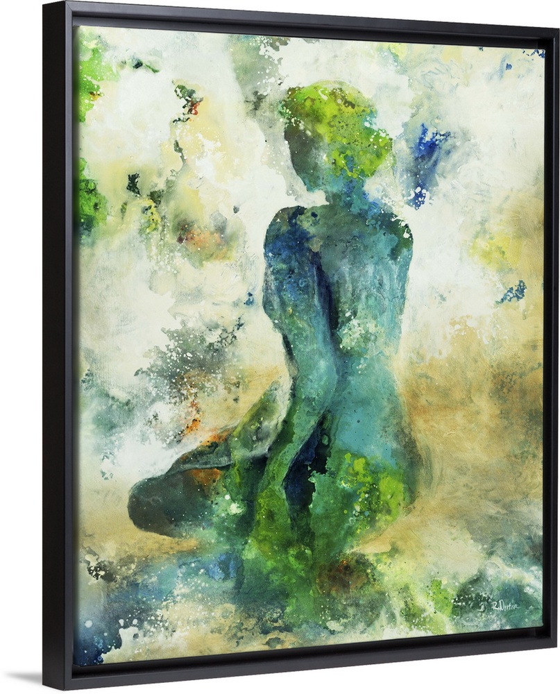 <p>Abstract painting of the silhouette of a woman kneeling down on a hill, surrounded by splashes of color in cool and golden tones.</p>
