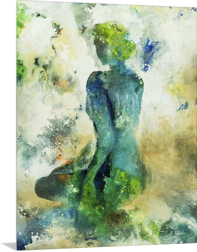<p>Abstract painting of the silhouette of a woman kneeling down on a hill, surrounded by splashes of color in cool and golden tones.</p>