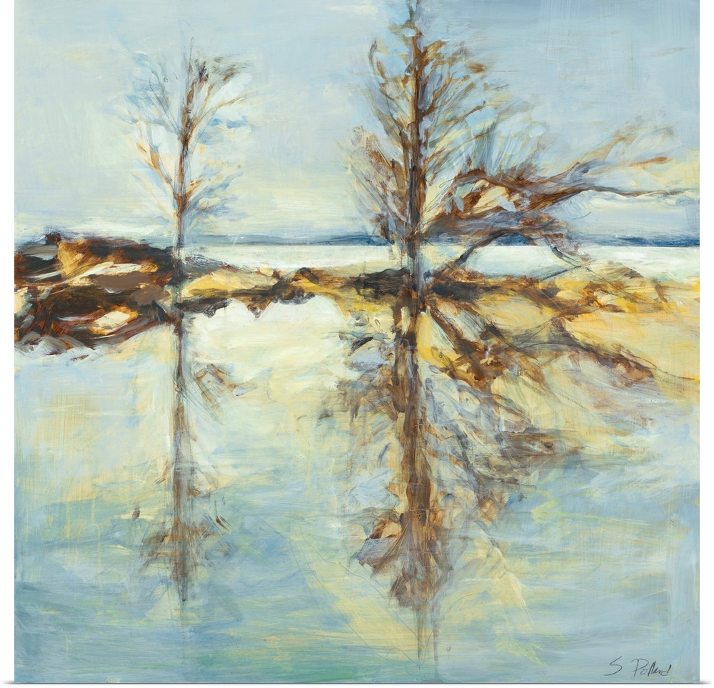 <p>Stacey Pollard is a contemporary, mixed-media landscape painter. Stacey says, "I find all of my compositions in nature, sometimes with structures, or any shapes or lines that I see. Using marks and paint to build up the surface, I enjoy walking the tightrope between creating an image that is abstract and also representative enough. My paintings start with many layers of acrylic glazes, and I also add texture with handmade papers or other materials. Grid marks, sketch lines, and remnants of materials remain embedded in the work, so that some marks from every layer are in the finished piece--the process becomes the narrative."</p>