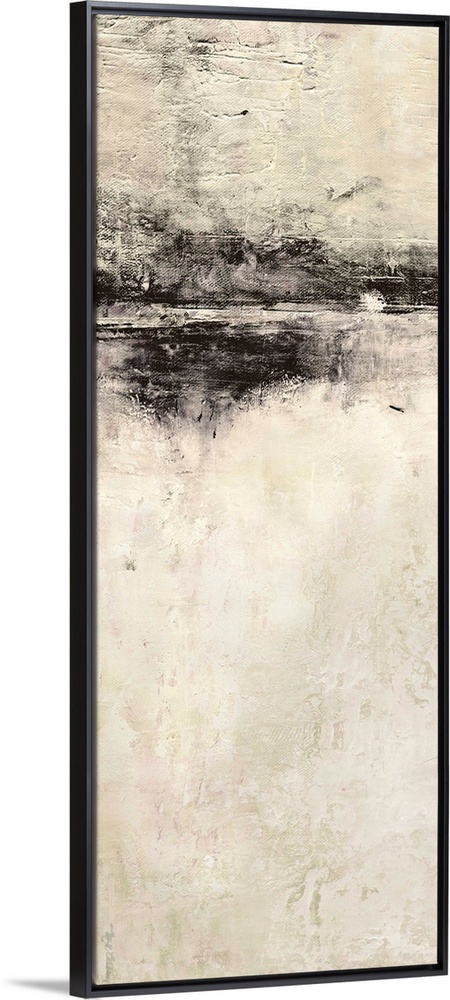 <p>A long vertical abstract painting of a rough stroked black horizontal line on textured beige.</p>