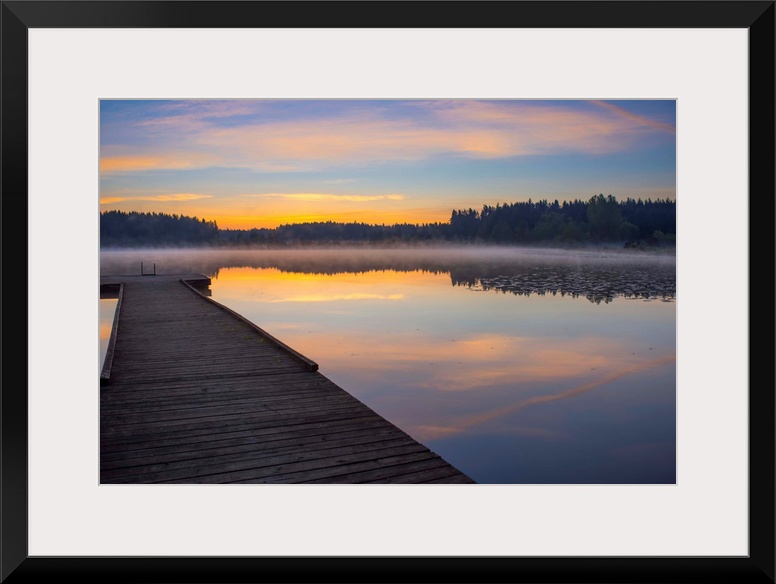 <p>Reflection of a beautiful serene sunrise on peaceful Scott lake, Washington, United States of America.</p>