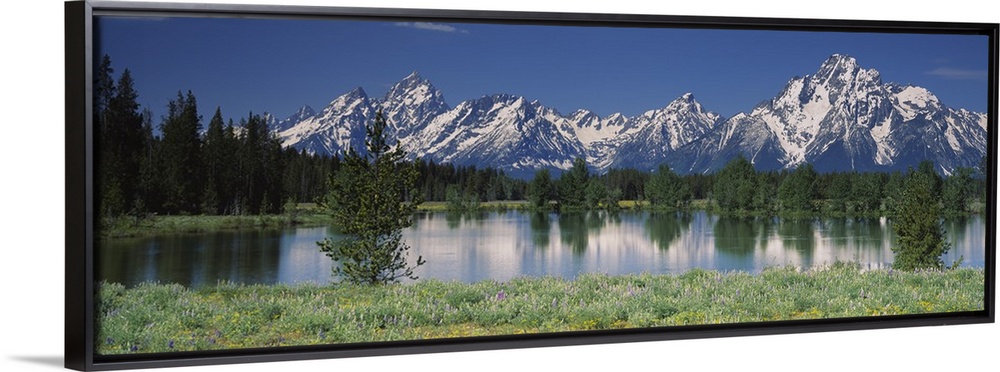 <p>Long canvas of snow capped mountains in the back of a forest reflected onto the waterfront.</p>