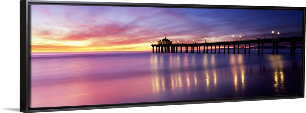 <p>Panoramic photograph of pier extending into ocean at sunset. The lights on the pier are reflected in the ocean and the sky is cloudy above.</p>