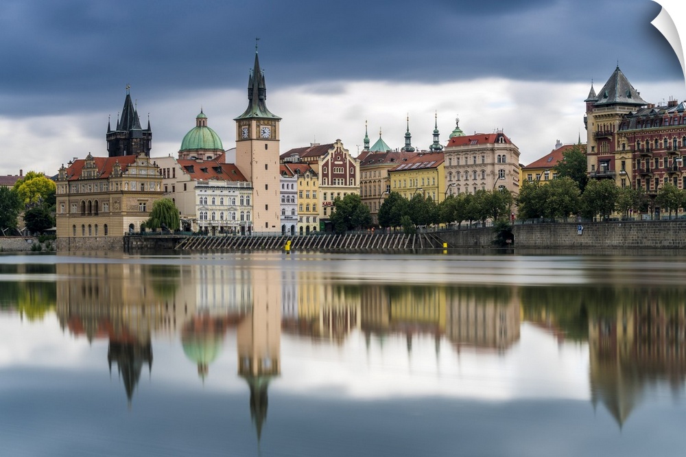 <p>Reflection of Bedrich Smetana Museum and Old Town Waterworks at Smetanovo nabrezi, Prague, Bohemia, Czech Republic</p>