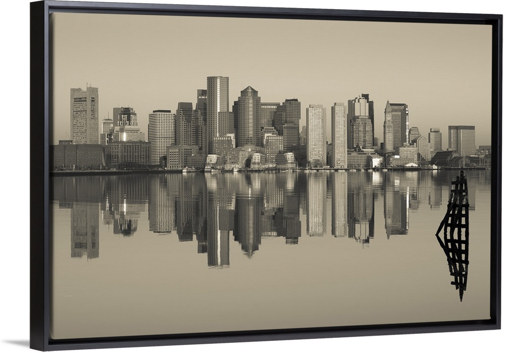 <p>Panoramic photograph of city skyline and waterfront on a clear cloudless day. The buildings are reflected in the waterfront below. Financial District from Logan Airport.</p>