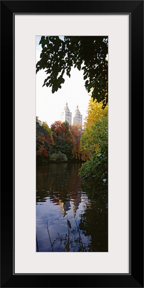 <p>Thick foliage lining a body of water is photographed with a view of a tall building in NYC in the background.</p>