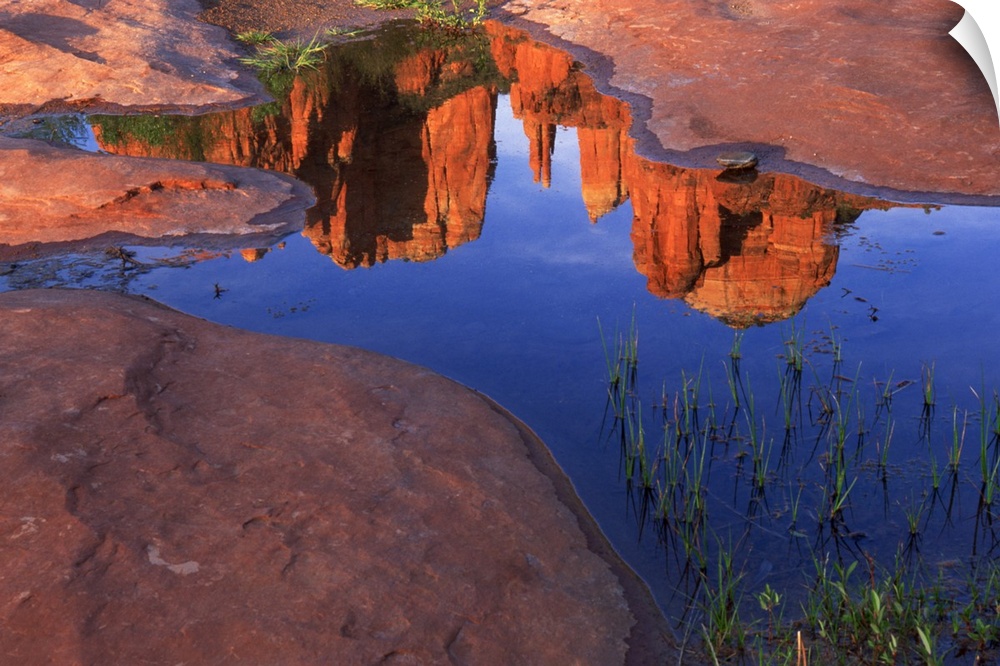 <p>Reflection of Cathedral Rock at Red Rock Crossing in puddle , Sedona , Arizona</p>