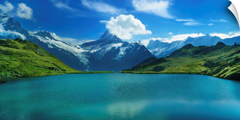 <p>Reflection of clouds and mountain in a lake, bachalpsee, grindelwald, bernese oberland, switzerland.</p>