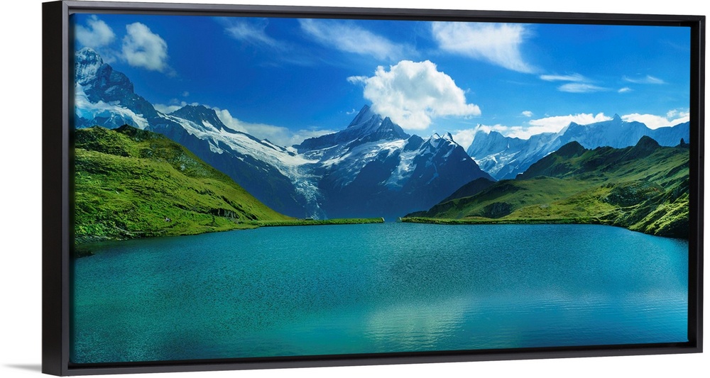 <p>Reflection of clouds and mountain in a lake, bachalpsee, grindelwald, bernese oberland, switzerland.</p>