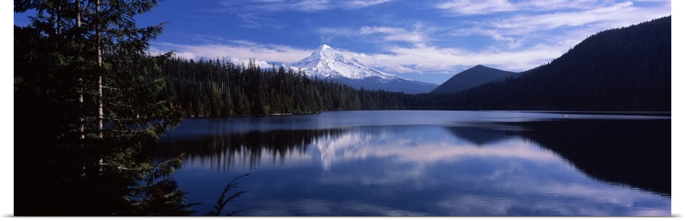 <p>A still lake photographed in wide angle view reflects a mountain that is seen just behind a thick pine forest. The sky filled with clouds also reflects in the water.</p>