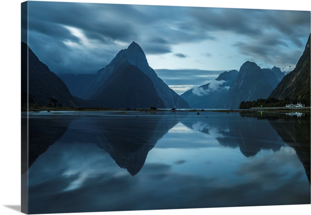 <p>Reflection of Milford Sound at dusk in summer. Fiordland NP, Southland district, Southland region, South Island, New Zealand.</p>