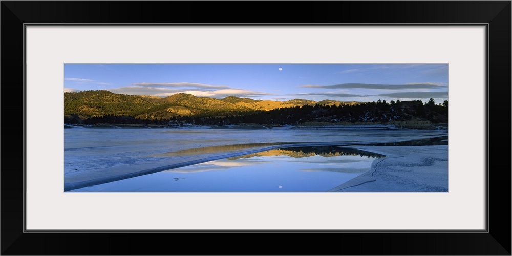 <p>Large photo on canvas of a lake with rolling hills in the distance and a moon shining bright in the sky reflected on the lake.</p>