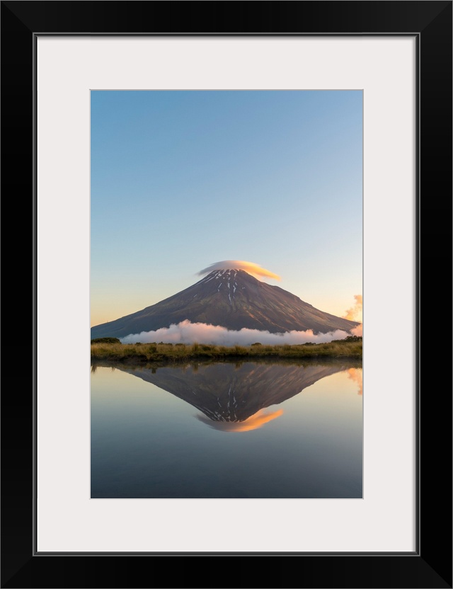 <p>Reflection of Mount Taranaki at sunset. Egmont National Park, New Plymouth district, Taranaki region, North Island, New Zealand.</p>