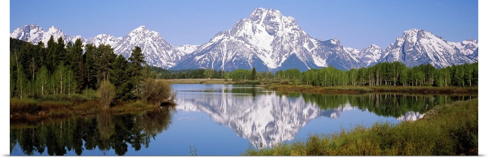<p>Panoramic photograph on a giant canvas of mountain reflections in the Snake River, surrounded by forest in the Grand Teton National Park, Wyoming.</p>