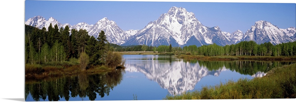 <p>Panoramic photograph on a giant canvas of mountain reflections in the Snake River, surrounded by forest in the Grand Teton National Park, Wyoming.</p>