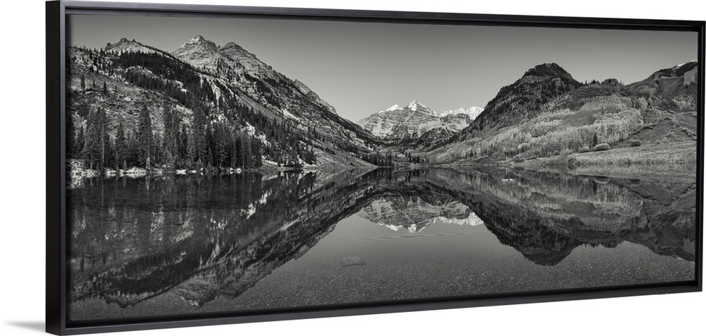 <p>Black and white photograph taken of large mountains and terrain that reflect perfectly in the still water below.</p>