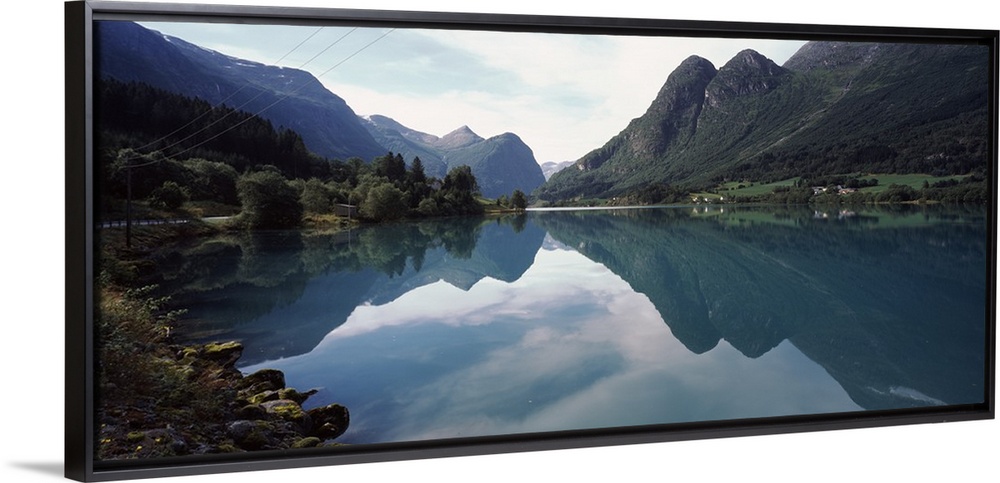 <p>A large piece that is a photograph of mountains lining a body of water that reflect in the still lake.</p>